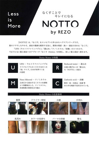 髪のツヤやしなやかさ、頭皮の健康を維持するために、薬剤の残留、臭い、頭皮の汚れを「なくす」「UFB(ウルトラファインバブル)」「還元水」「ナノミネラル」「炭酸」の4つの効果で、今までにない髪と頭皮へのアプローチ「なくす(Notto)」を実現し、美しい髪と頭皮へ導きます。